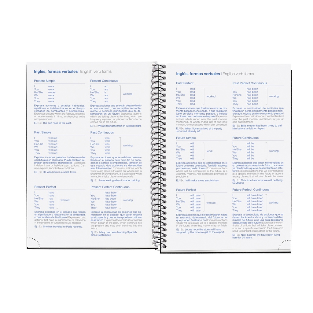 Cubiertas de cartón forrado plastificado mate (agendas Design). Encuadernación en espiral metálico con hojas microperforadas en la esquina para señalar la fecha actual. Anualidad: Semana vista (S/V) 10 meses: Septiembre 2025 a Junio 2026 semana a la vista + Julio y Agosto 2 semanas a la vista. Papel: 80 g/m², FSC Mix Credit. Idiomas: Castellano - Inglés Tamaños: ACTIVA (8º): 117 x 174 mm Contenido: Datos personales. Calendario curso. Horario trimestral. Planning mensual. Seguimiento exámenes y trabajos. Recomendaciones música, libros, películas y series. Mapamundi. Ausencias y retrasos. Comunicación familia / escuela. Inglés formas verbales y verbos irregulares. Teléfonos y direcciones. Notas. Incluye 1 página de stickers.
